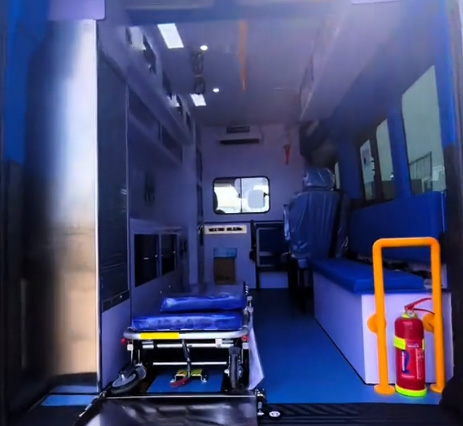 越野救護(hù)車的醫(yī)療艙,后門的右邊是一個鏟式擔(dān)架的固定位置。左邊掛著的是一個樓梯擔(dān)架,醫(yī)療艙的中間是一套自動上車擔(dān)架。左側(cè)是一個醫(yī)療柜,是帶卷簾門的氧氣瓶,兩個雙15升的氧氣瓶。還有醫(yī)療器械柜。在上面有四個上掀門式的柜門。中間是一組吊柜,下面是一組平臺柜。上面有220伏的電源插座,還有12伏的電源接口。旁邊做了匯流排,可以顯示氧氣瓶罐的壓力。還有兩個用氧終端,下面做了一臺這個負(fù)壓設(shè)備。左前艙有特別的裝置,所有車輛的集中控制,都在液晶大屏幕上面。上面有比較齊全的參數(shù),功能項非常的全面。中間隔斷頂部有個車載式空氣消毒機(jī)。中間是一個透明的觀察窗。折疊椅對講設(shè)備還有安全錘。車頂也做了220伏的電源插座。紫外線消毒燈,它是帶延時消毒的。右邊上部也是一樣有吊柜。也是非常實用的,右側(cè)有單人座椅配備三點式的安全帶。后面是三人的長條座椅,全部都配備了安全帶,座椅都做了骨架結(jié)構(gòu)非常的牢固。車都是做了大面積的軟包。防撞美觀都是不錯的。救護(hù)車我們也可以從中門下去。有上下車踏板。